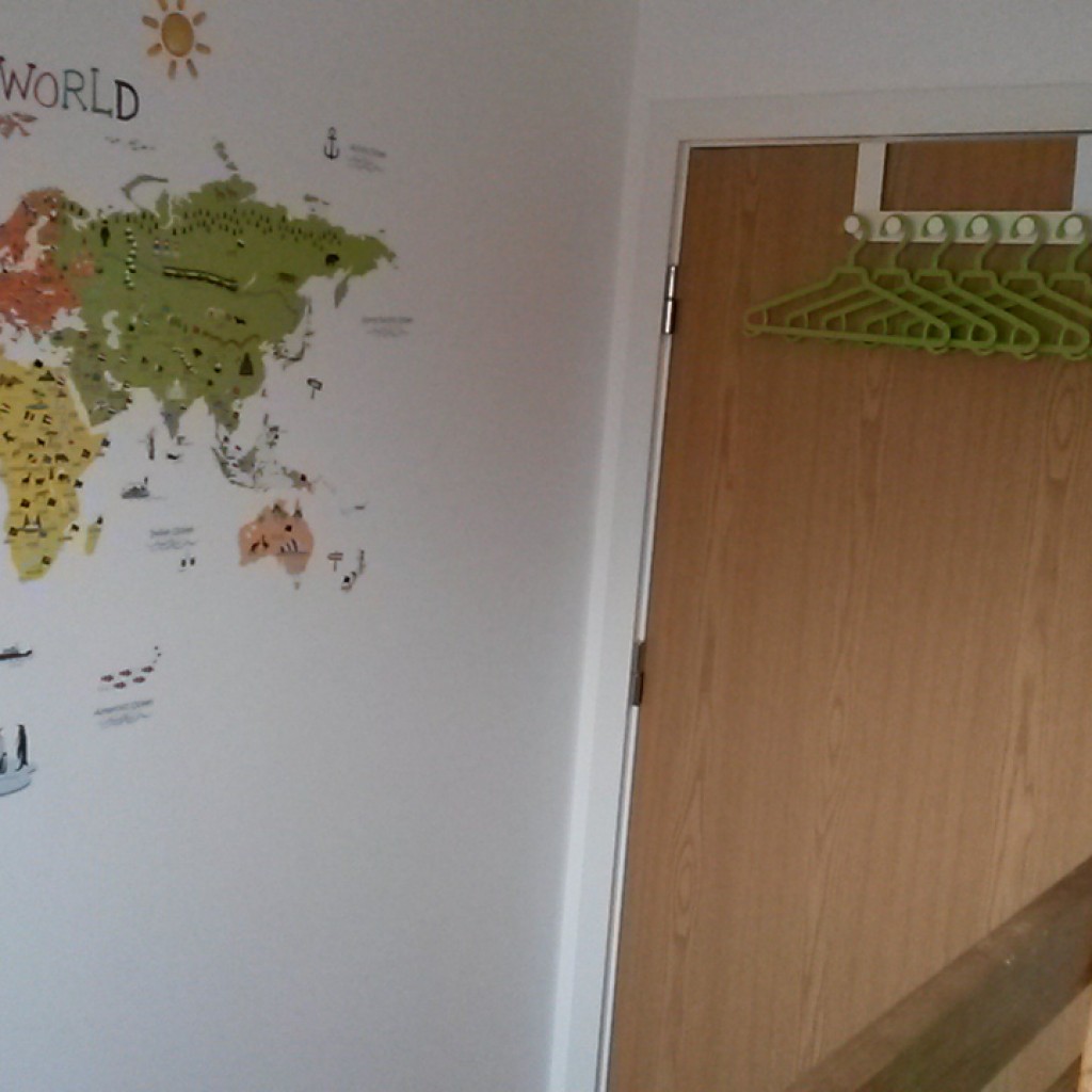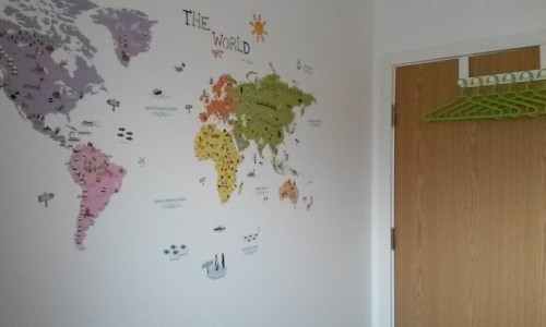 I hung an Educational World Map in colours that complement the room on the adjacent wall. This map shows the names the continents and countries, seas and the countries flags, and also interesting facts such as where the titanic sank!