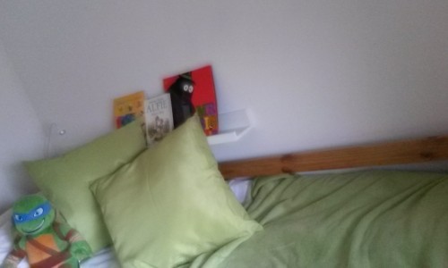 The room was freshened up with a coat of white paint, which will keep it light, bright and airy during the day. The drawer under the bed was fixed to hold a majority of the toys. The top bunk was given a long floating white book shelf with a reading lamp attached. I added a new crisp white duvet cover, and a sumptuous soft cosy green blanket and two large lime cushions to work with the room and match the green in the existing curtains, all making the bed a cosy top bunk space to snuggle up with a book at bedtime.