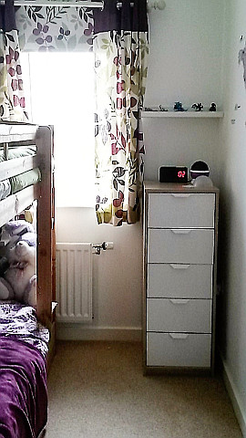 A row of hooks with green hangers was hung across the back of the door to give some extra storage for the school uniforms. A slim deep drawer unit was then built and placed in the far corner of the room to store clothes. A shelf was placed above to hold the Xbox figures! ( See above photo).
